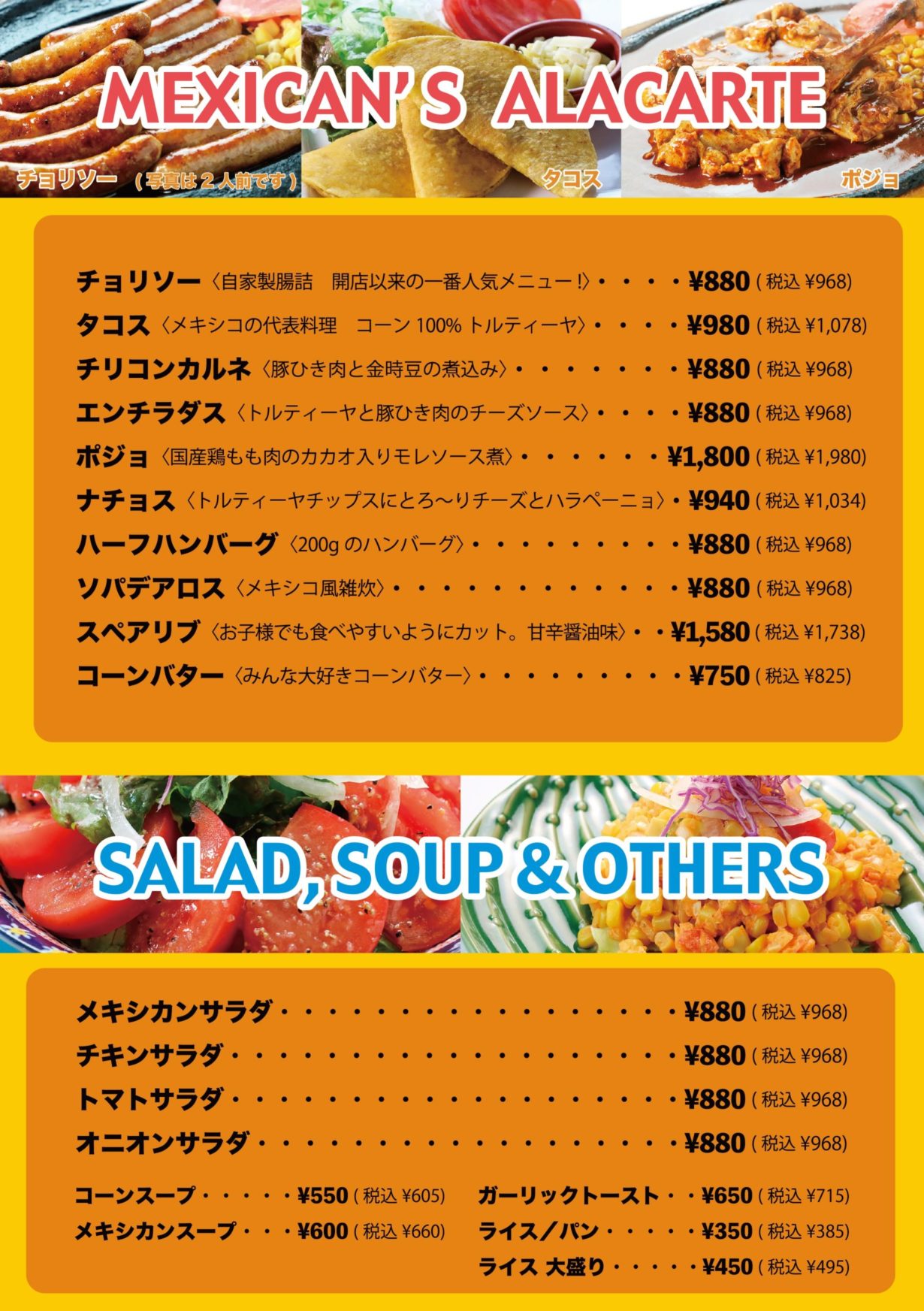 ステーキやハンバーグなどの定番肉料理、自家製チョリソーやタコスなどのメキシカンアラカルト、たっぷりサイズの各種サラダなど、盛り沢山なメニューをご用意。 もちろん楽しい会食のお供、アルコールやソフトドリンクも各種取り揃えております! また、スープ・ドリンク類以外の全てのメニューがテイクアウト可能です!